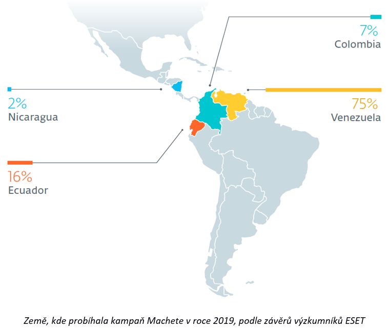 Výzkumný tým bezpečnostní společnosti ESET odhalil útoky na významné státní instituce v Latinské Americe. Více než polovina napadených počítačů patří venezuelským ozbrojeným silám. Mezi jejich cíli byly i další instituce, od policie a školství až po ministerstva zahraničních věcí. Většina útoků (75 %) se odehrála ve Venezuele, dalších 16 % v Ekvádoru, kde byla cílem také armáda. K dalším incidentům došlo v Kolumbii (7 %) a Nikaragui (2 %). Skupina, která stojí za těmito útoky, ukradla každý týden gigabajty důvěrných dokumentů. Skupina je přitom stále vysoce aktivní. Zaútočila navíc v době, kdy je situace v regionu napjatá.
